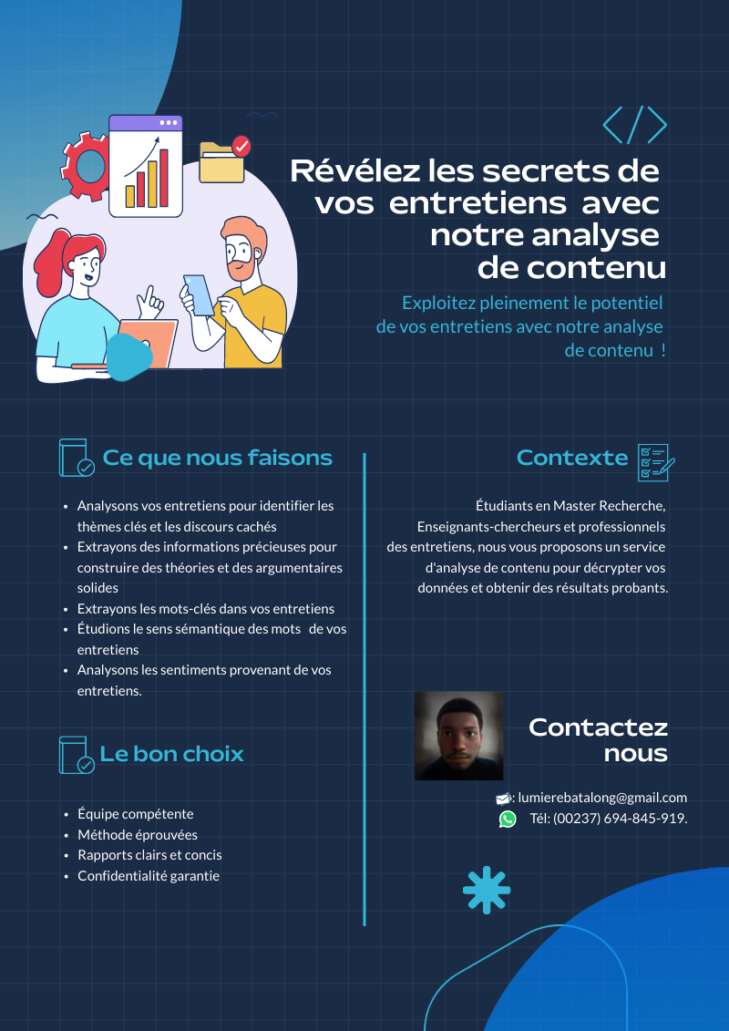 Étudiants en Master Recherche, Enseignants-chercheurs et professionnels des entretiens, nous vous proposons un service d'analyse de contenu pour décrypter vos données et obtenir des résultats probants...