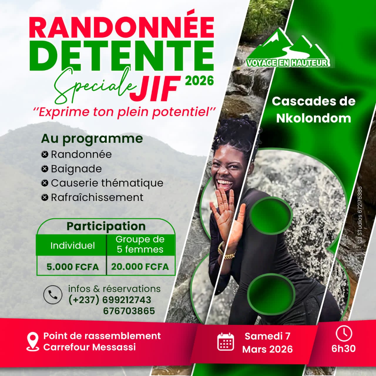 La baignade est également au programme de la randonnée détente organisée par l’agence Voyage en Hauteur ce samedi 7 mars dès 7 h 30 aux cascades de Nkolondom, dans le premier arrondissement de la capitale. Préparez votre maillot de bain pour une immersion dans les eaux de ce spectaculaire cours d’eau situé à proximité du marché Messassi, point de départ de l’expédition.