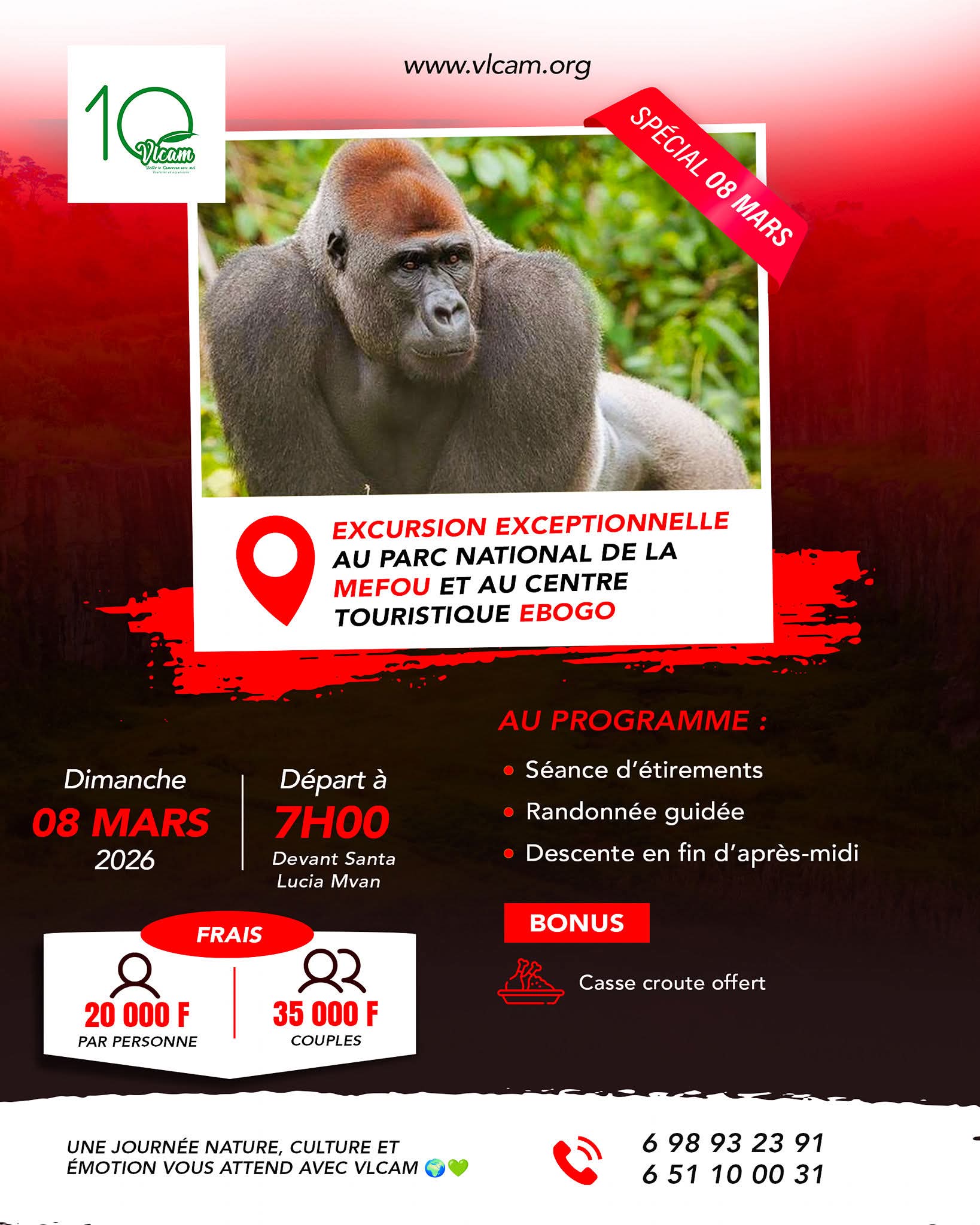 Le dimanche 8 mars, jour de célébration de la 41ᵉ Journée internationale de la femme, le bus prendra la direction de Mbalmayo. Mesdames, « Visiter le Cameroun avec moi » vous offre une journée immersive au Parc national de la Mefou et au site touristique d’Ebogo. Une occasion d’aller saluer Bobo le chimpanzé, Shufai’s le gorille, et de recevoir les bénédictions sous le Kossipo, ce majestueux arbre vieux de plus de 1 200 ans. Vous traverserez également les eaux du fleuve Nyong à bord d’une pirogue soigneusement apprêtée pour l’occasion.