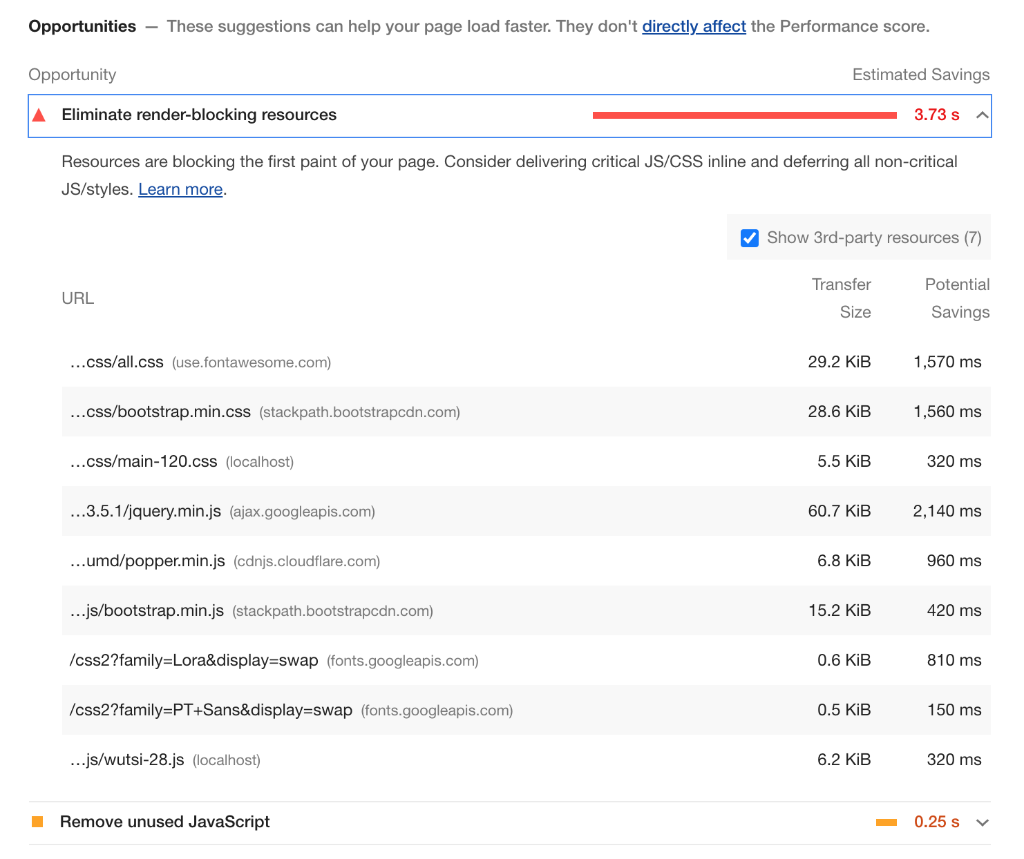 Next issue to resolve are the render-blocking resources. Render blocking resources are static files, such as fonts, HTML, CSS, and JavaScript, that are vital to the process of rendering a web page. When the browser encounters a render blocking resource, it stops downloading the rest of the resources until these critical files are processed. The more render blocking resource you have, to slower your page will be.