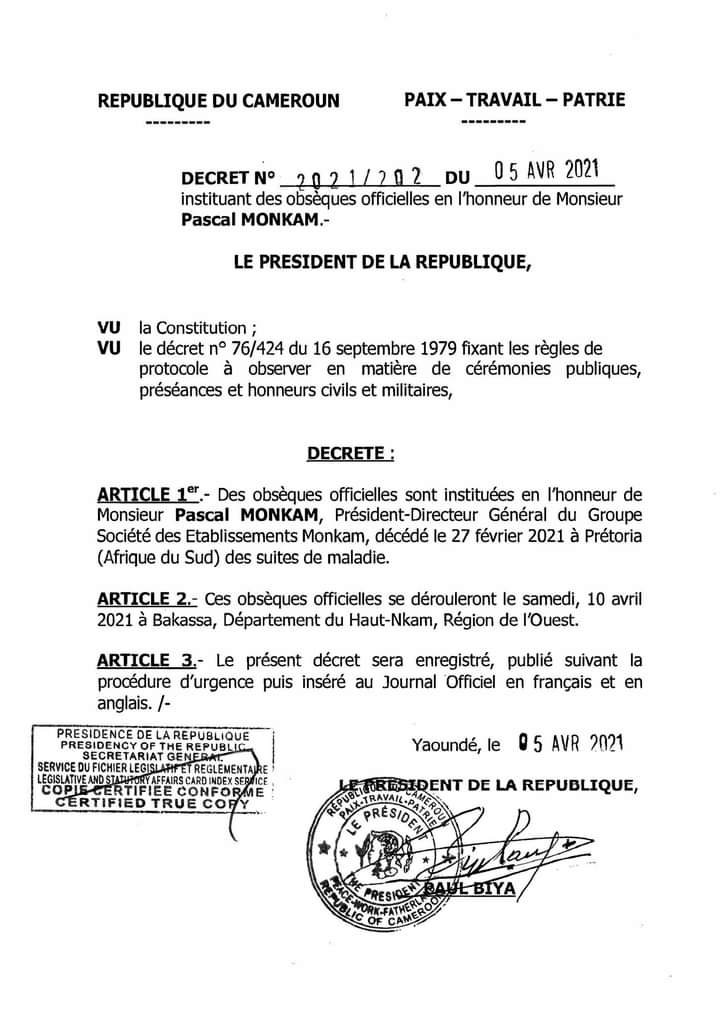 Le décret annonce l'organisation des obsèques officielles de l'homme d'affaire Pascal Monkam le samedi 10 avril 2021. L'arrête annonce le respect de l'une des mesures restriction prises le 17 mars 2020 par Dion Ngute pour cause de Covid-19 : la limitation de 50 personnes aux cérémonies de deuils organisées à l'ouest (funérailles et obsèques).