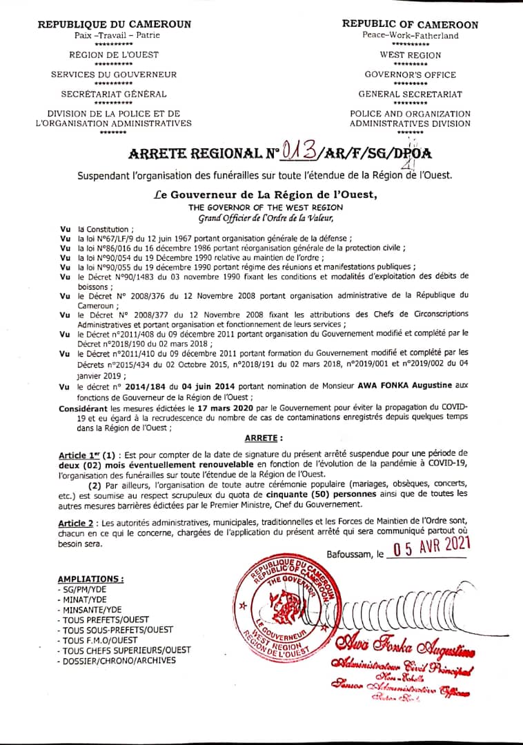 Ces deux textes (Décret du Président de la République et Arrêté du gouverneur de l'Ouest) n'ont aucun problème en soi. Ce qui est et reste questionnable c'est la présomption de non respect qui pèse sur l'Arrêté. En fait, on présume déjà que le gouverneur ne pourra pas empêcher l'organisation des obsèques officielles de l'homme d'affaires qui se dérouleront à Bakassa dans le Haut-Nkam. Il sera impossible pour lui de faire respecter cette mesure de limitation de 50 personnes.
