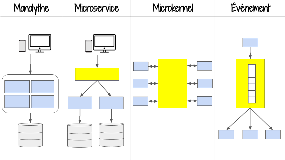 Voici les différents patrons d'architectures que vous avez a votre disposition. N'oubliez jamais que le type d'architecture que vous choisirez doit toujours dépendre de vos challenges et besoins. Dans la réalité, on combine généralement plusieurs types d'architectures: il est tres commun de voir des architectures qui combinent microservices et événements.
