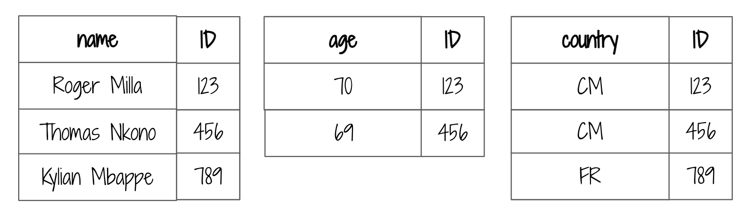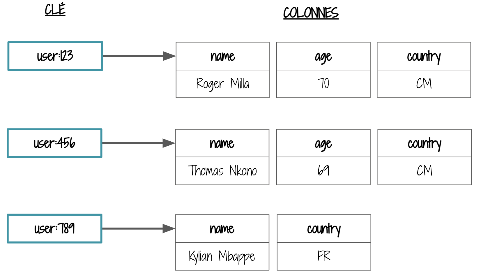 Par contre, si on veut faire une requête pour avoir les informations de l'usager 123, on devra extraire les informations à partir des colonnes name, age et country, ce qui n'est pas optimal pour ce type de BDD.