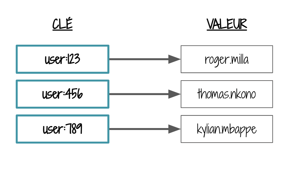 Les BDD de type clé-valeur sont les BDD les plus simples. Elles sont structurées comme un dictionnaire: elles contiennent un ensemble de clés uniques associées à des valeurs.